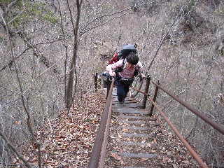 長い階段の登りが続きます。後ろからも登ってくる人がいますので休まずたゆまず登ります。梯子段状なので滑らないように・・・ |