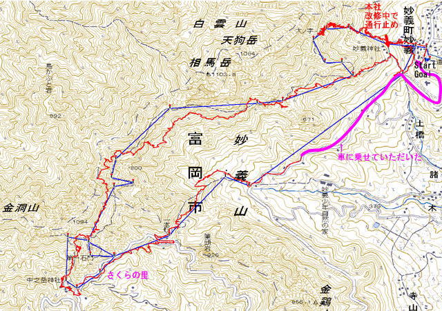 さくらの里を後にして一本杉から七曲を通って妙義山神社へ向かいます。 |