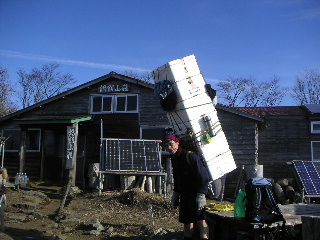 そうこうしているうちに草野さんが到着。鍋割には何回か来ているが、膨大な量を背負ったその姿を実際に拝見するのは初めてだった。圧倒される。重量は50キロを超えているという。華奢な体格に見えるのにそのエネルギーはどこからくるのだろう。その荷物の多さの様子だけでもと思って「写真を撮らせて貰って良いですか?」と遠慮がちに尋ねてみたら、なんと一度下ろした荷物をまた背負ってくれるではないか。その気持ちの優しさに申し訳ないやら嬉しいやらだった(草野さん申し訳ありませんでした。恐縮してます)。