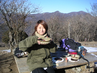 早速作って戴いた鍋焼きうどんを娘は初めて食べるわけだが、熱い土鍋に具だくさんで「わぁ、きのこがいっぱい。あっ、カボチャが入ってる、レンコンが入ってる・・・と、ひとつひとつ感激の声を出していた。山荘の中の温度計は氷点下2度を指していると草野さんに教えて貰い、外の方が暖かいかもと言われたが、やはり土鍋の熱さが有り難かった。