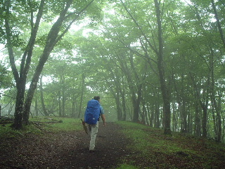 とりあえず無線で連絡をとり、それらの処置をしてから鍋割山へと向かった。多少のアップダウンがあるが、もうそれほどきつくはない。雨は止んでいたがガスっており、幻想的で素敵な尾根歩きだ。この悪天候でも途中数グループとすれ違ったが、なかでも40名パーティと出会ったときは驚いた。天気が良かったら、もっと混んだのだろう・・
