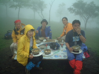 鍋割山山頂に着くと、先に注文してくれていた鍋焼きうどんがちょうど出来上がったところだった。ここで川口さんに合流。お待たせしたのを詫びて、ほっと一息。小屋の外で、今回の目的の鍋焼きうどんを皆で戴く。ガスっていて、無論富士山は見えないが、雨がやんでくれたので良かった。