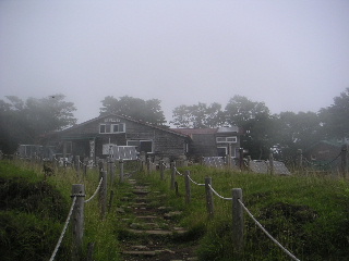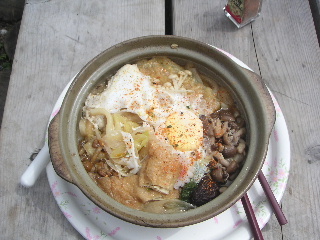 15分か20分ほどで山頂、登山者はまだ誰もいなかった。ややガスがたちこめて名物の富士山は当然見えない。山頂では鍋割山荘の屋根の修理をしているらしく、金槌の音が響いていた。その仕事の手を止めるのは気が引けたが草野さんに鍋焼きうどんを注文。気持ちよく返事があって、さてうどんが先か、トシちゃんの到着が先か、待つこと数分。うどんの方が早かった。なのに間もなく着いた夫はうどんより氷が食べたいと言い出し再び注文。美味しいうどんを食べた後はコーヒーを注文して・・・と、ここは山か?とツッコミが入るところだ。