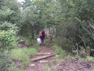 山頂でゆっくりしている間にそれでも次々と人が登ってきた。今回は軽く歩こうということで同ルートを戻ることにした。トシちゃんは空のザックに小屋からの荷下げの空ペットボトルを詰め、片手にもポリ袋に詰めた物を持って、のんびりと下っていった。さすがに目立つものだから続々登ってくる人の注目を浴びている。