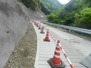 少しだけ林道の左端を歩きます。平日はダム工事車両が通るのかもしれません。 |