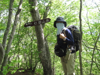 仁田山岳。 桐生岳山頂では暑かったので、最近ゲットの紫外線よけニューグッズを!でもこの後樹林帯だったので結局すぐ外してしまいました^_^; こちらの展望はありませんが、4月終わりごろアカヤシオが見事に咲くそうです。 |
