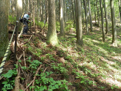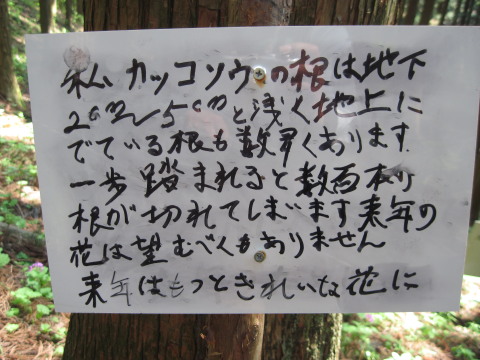 こんな風に写真を撮りながら時間をかけて歩いていると、後ろからスタスタとお一人近付いてきました。パトロールの腕章をつけて(この後も何人か)いらっしゃいましたが、この時プリントされた鳴神山のコース図をわざわざザックから出してカッコソウの復元地を詳しく教えてくださいました。運よく戴けて助かりました。 この時ヒメイワカガミの咲く場所なども教えて下さり、その後はまた「お先に」と前へ。鳴神山を愛する会と書かれていましたが、有り難いことです。ご苦労様です。 |