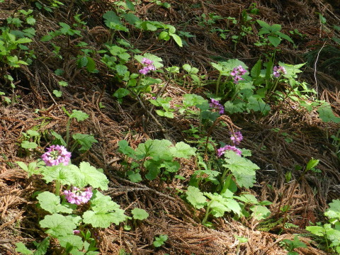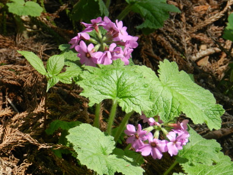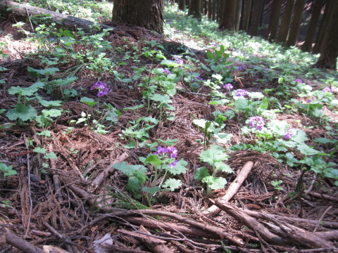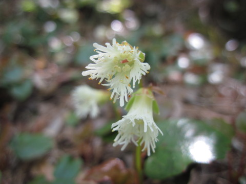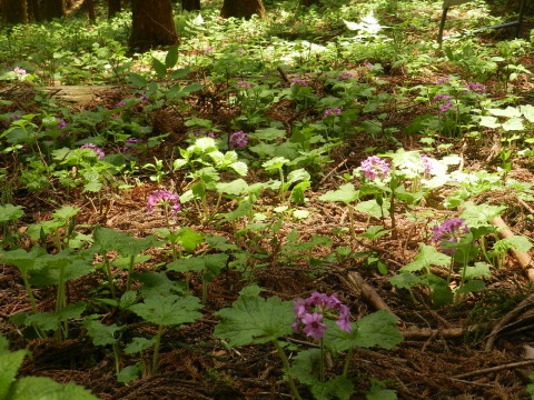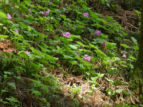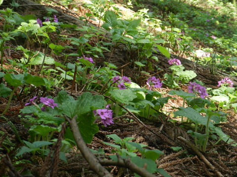 | 前日の小丸山に引き続き近くの鳴神山へ。希少野生動植物種のひとつカッコソウを見に行ってきました。丁度見頃で、他にもヒメイワカガミ(コイワカガミ)やルイヨウボタンなどいろいろ楽しめました。今回通らなかったコツナギ沢のヒイラギソウはまだ蕾だったそうなので次の週末辺りは見られるかもしれません。 |