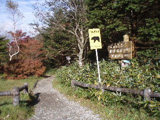 | 8:10 熊がいますよ〜という立て看板がありますが、全然緊迫感を感じない、駐車場脇の登山口を行きます。 まっすぐ行けば沼原湿原ですが、間もなく右へ道が分かれていました。看板はありませんがそちらへ行きます。登山道の近道でした(小さい看板でもあれば分かり易いのに・・)。 |