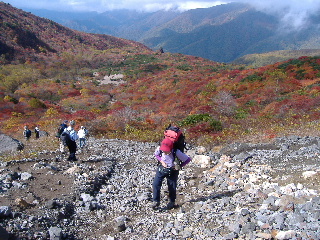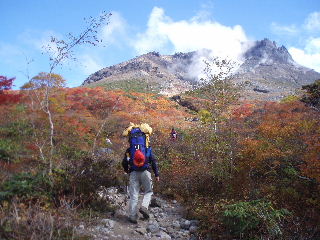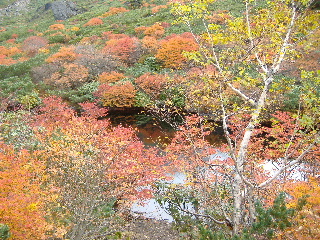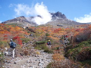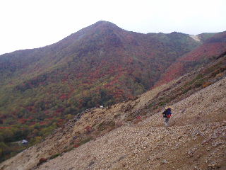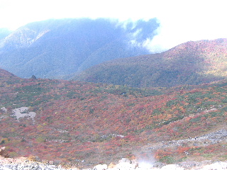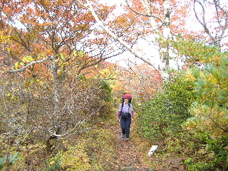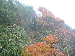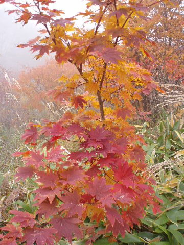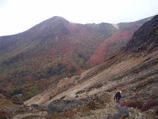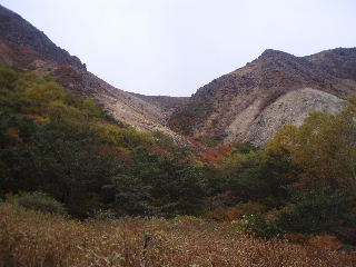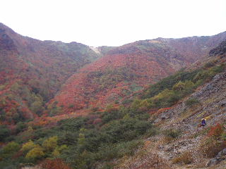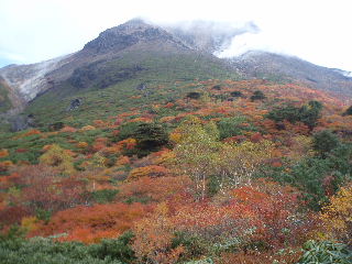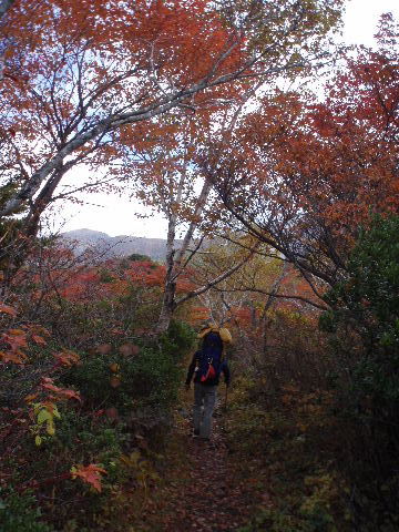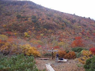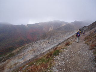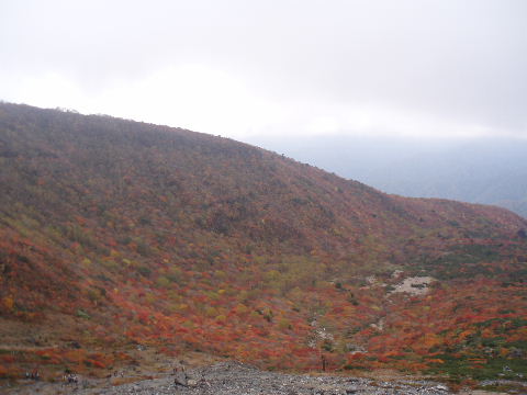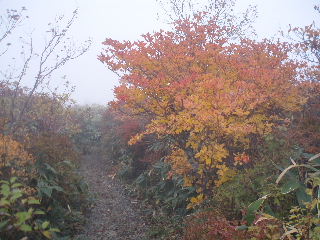 | いきなり前方に錦秋のキャンバス! 茶臼岳は煙を吐いていますが、稜線はガスがかかっているようです。 しばし見とれて少し下ると三斗小屋の分岐でした。少し休んで牛ヶ首に向かいます。 |