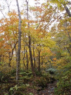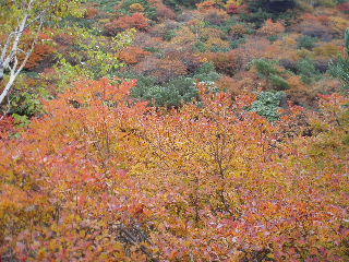 | この分岐の木々の間から三斗小屋方面の山の斜面もまた見事です。 | ||||