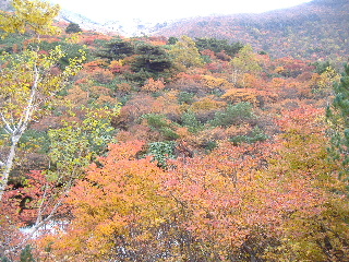 | たまには二人の写真も^_^; 春を過ぎ、夏も過ぎ、いまや紅葉期の二人です ← どこからか落葉期ではというツッコミもきそうですが(トシちゃん既に落葉・・・)・・・冷たい厳冬期だったりして(爆) この写真を撮ってくださった人はカメラが趣味の地元の方で、こんなに見事なのは初めてと絶賛でした。私たちも良い時に来ました。 |
