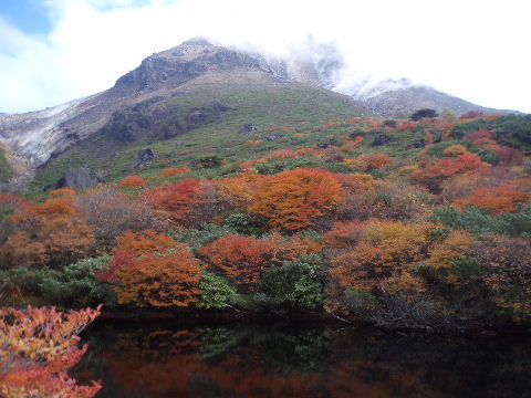 そして先に進むと1、2分でウバヶ平。 いきなり広々した場所に出てまたまたびっくり! 正面には茶臼岳、まるで華やかな衣装をまとっているようです。 こんなに見事な紅葉は10年前の八甲田や月山、鳥海山、 また7年前の谷川の馬蹄縦走、以来かもしれません。 いえ、それ以上!おそらく今までで最高です\(^o^)/ ↓ |