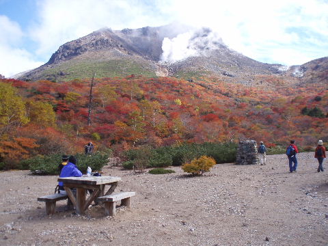 | 私たちも眼下のウバヶ平周辺の紅葉を楽しみながら早めのお昼休憩にします。 | ||||
