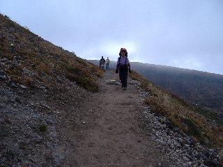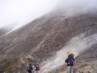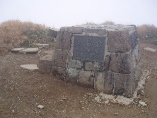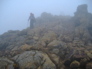 | 20分ほどの休憩中に茶臼岳山頂はガスに覆われてしまいました。稜線もガスガスなので容易に晴れそうもありません。山頂展望はあきらめ、トラバース道を峰の茶屋に向かうことにします。 | ||||