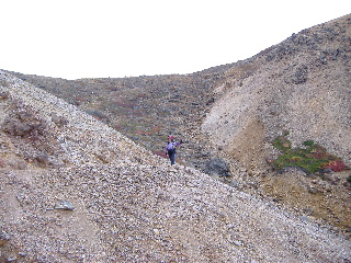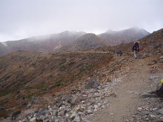 | 小さなアップダウンや右がきれ落ちたガレ場を通過して三本槍への分岐(熊見曽根)を見送り、朝日岳もガスなので肩からそのまま下ります。 | ||||
