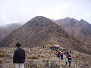 | 寝る場所を確保し、必要なものだけ持って出発〜!ところが・・・ 予定ではこの日の内に三本槍岳の先、鏡ヶ沼辺りまで往復するつもりでした。でもここで時間を確認するとちょっと厳しい!のんびり歩こうというコンセプト(ただ歩けないだけやん!^_^;)での行動でしたが油断でした(^^ゞ やはりもう少し早めの出発が必要でした。予定は明日に変更します。 でもこのまま小屋では時間がありすぎて退屈ですから、三斗小屋まで散策することにします。(写真は小屋から見上げた峰の茶屋鞍部・・・明朝この風景が一変?します) |