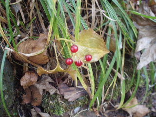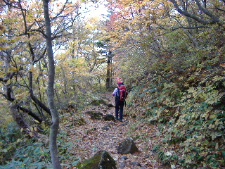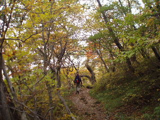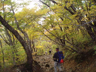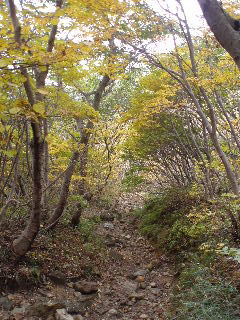 | こんな道だったっけ?と話しながら、途中で地図も確認しつつ下りて行きました。滑りやすい急な下りで結構気を遣いました。 平坦な所まできて、上着を羽織ります。気温がかなり下がってきました。 この時「こっちに来なければ良かった・・・」とトシちゃん泣きが入ります。「今更しょうがないでしょ!」と流します。 |