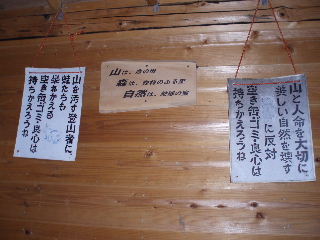 | 樹林に入ると落ち着いた黄葉の木に囲まれ、まもなく避難小屋。中には誰もいませんでした。ここに泊まるのは二回目。中には戦争(消えてますが)と蛙バージョンの看板がありましたが、tacoball3さんの山看板発見は既に認証済みでした、残念!(^^ゞ | ||||