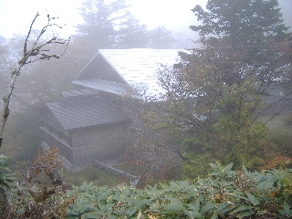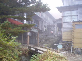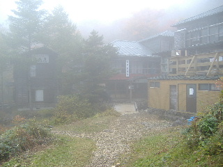 | 13:33 三斗小屋温泉に着きました。山奥とは思えないほど大きな温泉宿が並んでいます。泊まってみたかったのですが、急に予定を組んだことと混雑する時期と思い(夏の北ア、高天原で懲りていましたので^_^;)止めました。 このあたりもガスがかかってきていました。 |