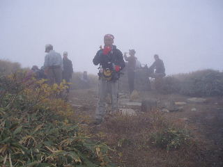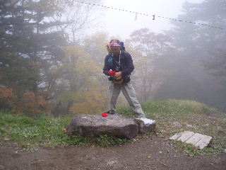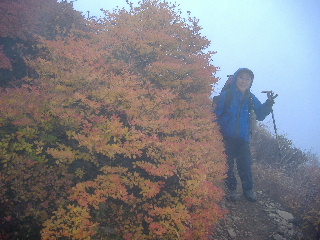 | 14:49-53 晴れていれば展望も紅葉も見事なのでしょう。歩く周囲の紅葉だけ楽しみながら滑りやすい急登を行くと隠居倉。着くと同時に反対側からも数名のグループが来て一挙に賑やかになりました。 隠居倉って、何か意味があるのでしょうか?Mt.Inkyoguraと書いてあったので、そこで隠居倉山?と今更ながら思ったのですが、何かのこん跡があるのかと思ってました^_^; 来る前にこの辺りのことは全然調べていませんで(^^ゞ でもこんなギャップを楽しんだりするのって好きです♪ |