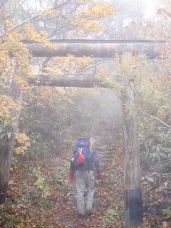 | 13:52 同ルートを戻ろうかとも思ったのですが、隠居倉の方からまわることにしました。 三斗小屋から登っていくと鳥居を潜ります。 |