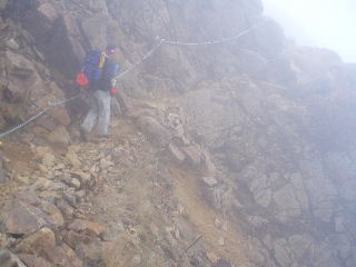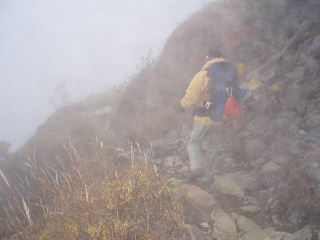 | ガスで分からなかったのですが、上着を羽織った所からは峰の茶屋まで平坦なトラバース道になりました。 以前ここを、三本槍への往きは天気で普通に歩き、戻ってくるとき降雪で完全にルートが消えていたことがあります。そこをピッケル刺しながらトラバースしたのですが、数時間の違いでガラリと風景が変わって、あの時は本当にビックリでした。あの時もトシちゃん泣きが入っていたなぁ・・・(^o^) こっちは必死だったけど!^_^; |