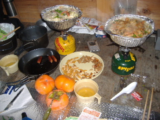 | そうなりゃ宴会♪(って、いつもジャン!(^^ゞ) 梅酒のお湯割りでかんぱ〜い!手軽にコンビニの鍋焼き(チャンポンと天ぷらうどん)。待つ間におつまみが無くなってしまいました^_^; あ〜ぁ、おすそ分け用に持ってきたのに・・・柿。 |