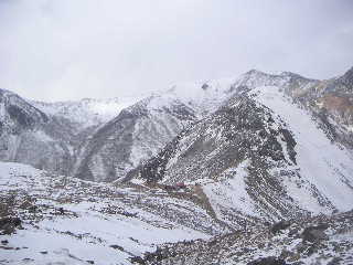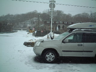 | 朝起きると薄っすらと雪が積もっていました。着いた時には見えていた舗装道路が一面真っ白です。 | |