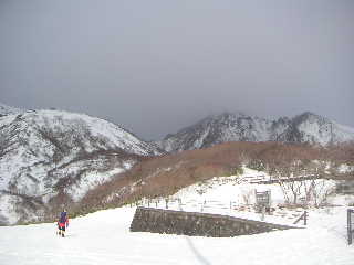| 東屋のそばに展望台がありましたので上がってみました。展望台から朝日岳、三本槍岳方面です。間の奥に見えるのが三本槍岳山頂でしょうか?ちょっとわかりません。 | |