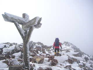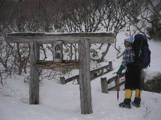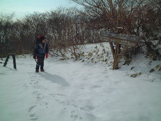 | 標識のところまで来るとまた雪が少なくなりました。山頂はもうすぐ。 | |