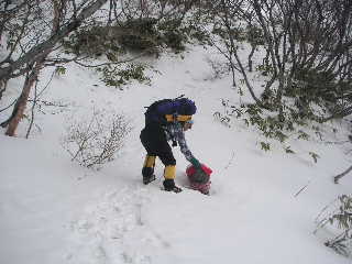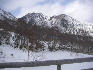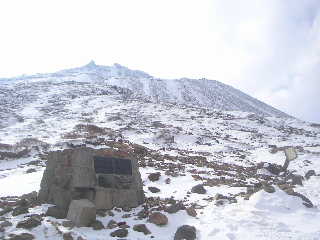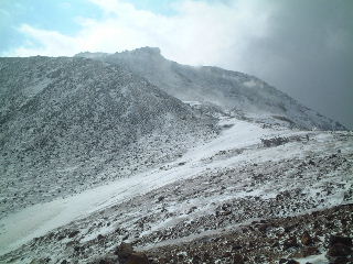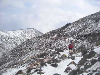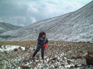 | 相変わらず雪は少ない斜面をひと登り。強烈な硫黄の臭いがしてきたので風防をマスク代わりにします。 | |