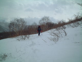 | 積雪は少ないです。風の通り道でもありますが、やはり今年は少ないのでしょうか。 前方の尾根に峰の小屋が見えてきました。 |
