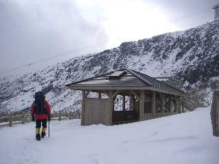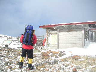 | 10:18 峰の茶屋に到着。以前来た時は、三斗小屋に向かって少し下った避難小屋に泊まったのでした。 この小屋も左側から冬季の小さな入口があり、中は使えるようになっていました(下山時に確認)。 |