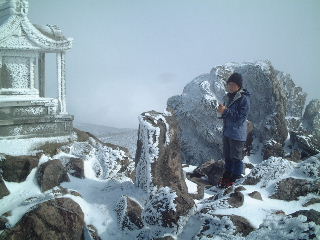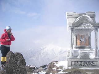 | 11:10-12:10 茶臼岳山頂。雪を被った祠は小さいながらも神々しいですね〜。 |