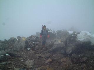 | 時折青空ののぞく山頂で、展望が開けるのではと期待しながらのんびりと待ちましたが、諦めて下山です。また季節を変えて来たいと思いました。 | |