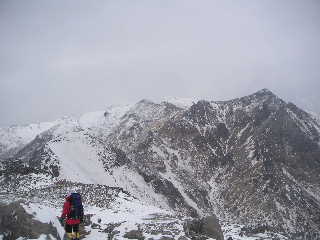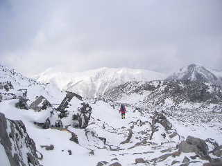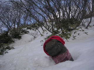 | 朝日岳の方から歩いてきた人がトラバースしているのが見えます。かなりの急斜面ですから怖かったのを思い出します。私達がそこを歩いたのは4月。行きは雪がそれほどでなく普通に歩いて行ったのですが、途中から雪になり帰りは全くトレースがなくなるほどの降雪になっていたのでした。 積雪期は正面の山を越えた方が良いようで、良く見ると踏み跡が見えます。この山を越えるのも大変そうですがどうなんでしょう。 |