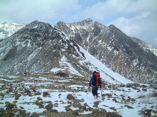 | 下りの早いトシちゃん、ドンドン下りていってしまいます。下に小屋が見えてきました。 | |
