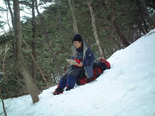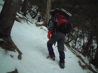 | 久々のテント泊装備がこたえます。しかも最初からかなりの急登。なかなか休めるような平坦な場所がありません。 それでも大丈夫そうなところで一休み。ここでアイゼンを着けます。 |