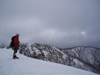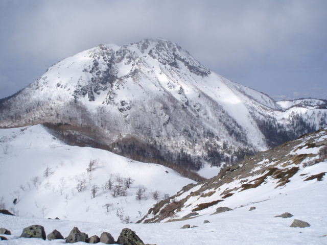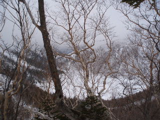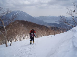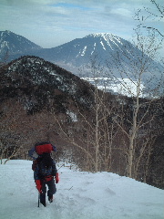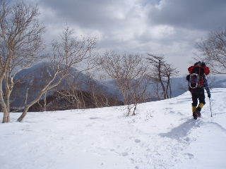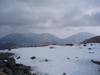 | 途中、金精峠方面が見えてきます。中ツ曽根の尾根の向こうは金精山のようです。例年ならばもっと雪が積もっているのでしょう。 | |