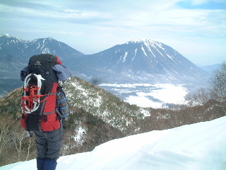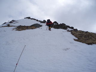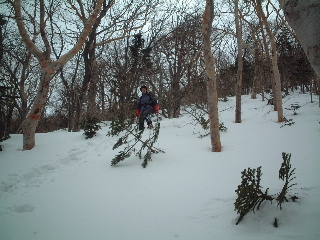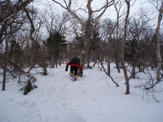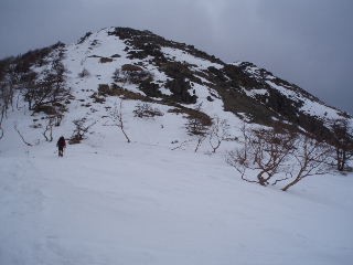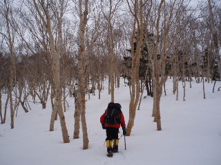 | リフトに添った緩やかな初心者コースを登り、稼働中のリフトの終点辺りから左へ曲がります。夏道登山道はリフト終点の辺りからのようですが、雪山なので手前を直登。 地図を確認していると、三人のパーティが軽快に脇を通過していきました。 この急斜面、下山時はシリセードが出来そうですが、大きなザックですし、今回はシリセード用の雨合羽がありません。 |