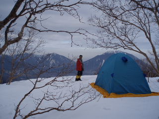 | この日光連山を目の前にして最高の気分です♪雪がすくないですね。 北のほうには会津駒ケ岳、燧ケ岳方面が望め、こちらはさすがに雪山の白さが目立ちました。 左の写真にカーソルを充てるとテントの中からの眺望に変わります。 |