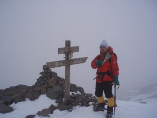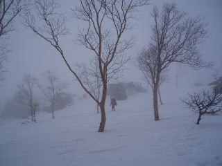 | 小屋の中の寝場所は3段構造になってました。詰めれば20〜30にんくらいは入るのでしょうか?昨夜も10人以上は泊まったようです。 外で休んでいると足跡の残っていた先行の単独男性が下りてきました。山頂まで行ってきたそうですが、ニコニコと気持ちの良い若者でした。当然ながら何も見えなかったと言い、この後五色山の方から湯元へ下ると言ってました。 |