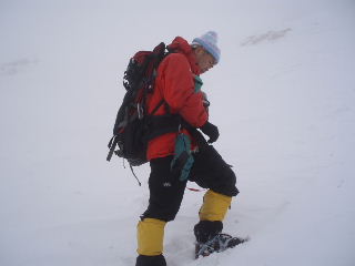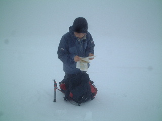 | ここもかなりの急登です。 途中ぽっかりと穴のあいているところがあり、水が流れているのが見えました。気温があがったらヤバイですよ・・・・ 山頂方向は相変わらずガスの中。地図と高度計で、現在地と、あとどれくらいかを確認します。 |