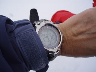| 多少の誤差はあるかもしれませんが、標高約2470m地点。 雪の状態に不安があったことと、山頂展望が無理そうなこと、予定のタイムリミットを考えると、ここで引き返した方がよさそう・・・ |