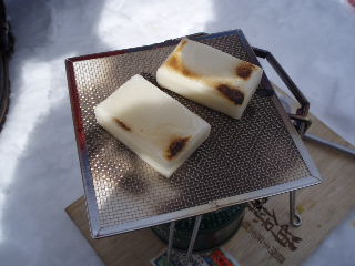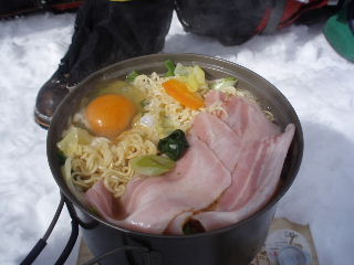 | テント撤収し、早めのお昼はラーメン。そしてお餅入りのぜんざい!食べすぎ?でも下山するとすぐまたおなかが空くのです(^^ゞ | |