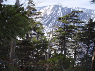 | 外山尾根を下りながら登りのきつさを再認識し、分岐から湯元へと向かいますが、この下りもやっぱり同様でした。 途中で中ツ曽根、金精山を眺めながら最後の休憩をしていると、なんとSさんたちも下りてきました。随分早いとびっくりしていると、雪の状態を見て、やはり途中で引き返してきたそうです。 |