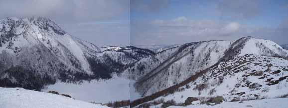 | 私たちもその展望を楽しみます。 左写真の中のピークが前白根山、右がsanae隊のテントがある山頂。 |