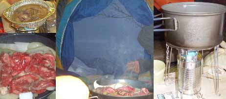 【↓ テントの中で日光連山を眺めながら、焼肉とモツ鍋。元気がでるかな・・・^_^;】 ![]() |