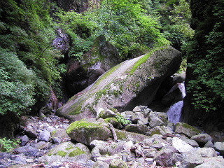 左【小川谷風景3:傾斜角50°の大岩】 (phot by Mr.Sakamoto 2002.07.06)